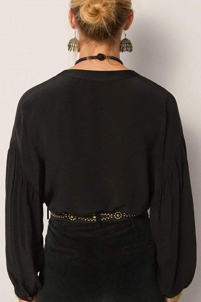 Cut in silky viscose, this blouse drapes with quiet fluidity while retaining definition through its tailored bib front. The deep black tone gives it timeless versatility, refined but strong.