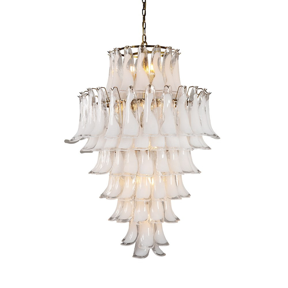 Josephine Chandelier features white frosted cut glass and antique brass finishes.