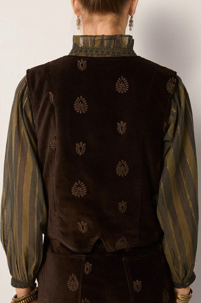 Crafted from plush cotton velvet, the Kafka Vest is substantial yet soft, with a natural drape that holds its shape. The Macchiato tone — a warm brown softened by light — carries the richness of coffee beans mellowed by cream.