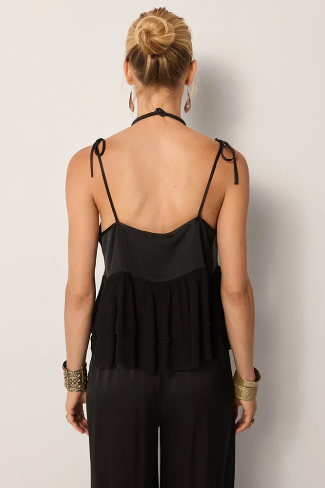 Styled here with the Nadine pant in Noir and metallic jewelry for a sleek monochrome mood. Just as right under a blazer, where the ruffles soften sharper tailoring.