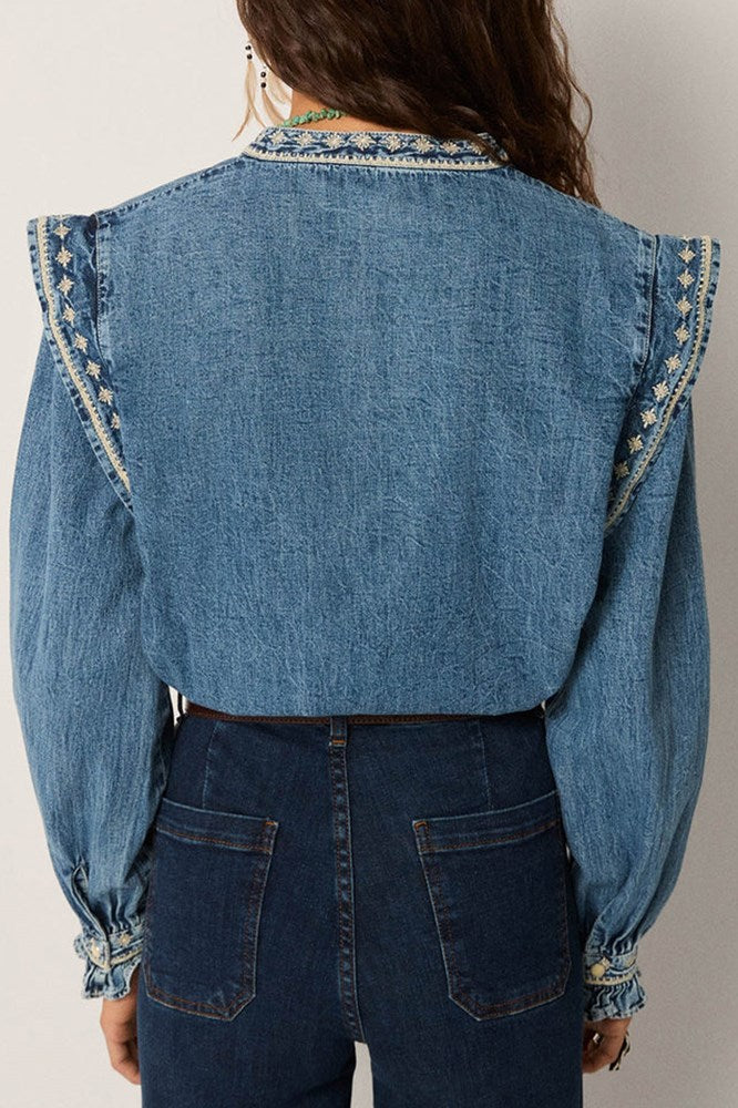 Across chest and sleeves, ivory florals unfurl like stitched gardens, adding delicacy to the rugged ground. The embroidery lightens the denim, lending movement and intricacy to a fabric built for endurance.
