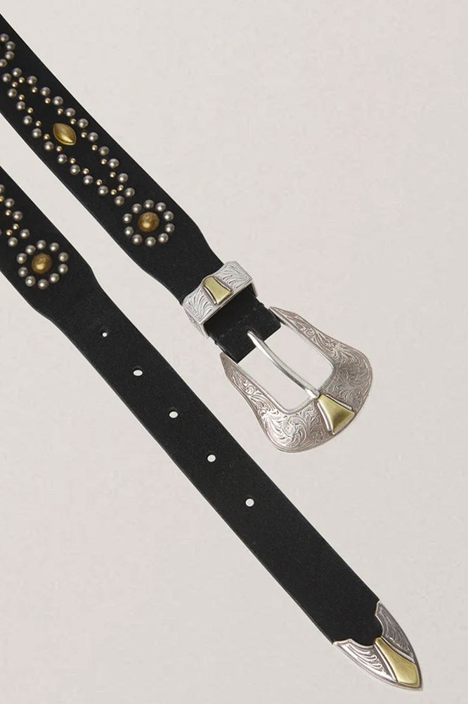 The Pancho belt Midnight Silver Belt is a western-inspired piece in soft black leather. Designed with a finely engraved silver buckle featuring golden accents and studded details, it’s the perfect accessory to add character and definition to any look.