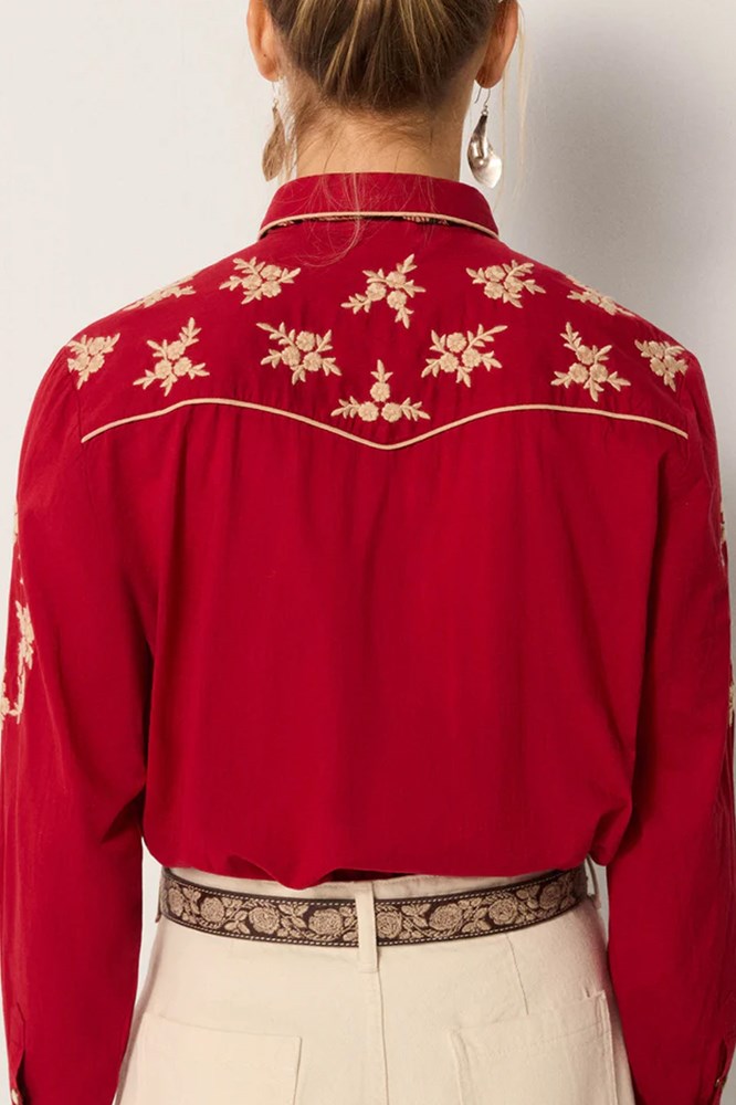 Intricate contrast embroidery traces the chest, sleeves, and back, accented with piping and snap buttons that highlight its cowboy character. The red tone gives it presence without overwhelming.