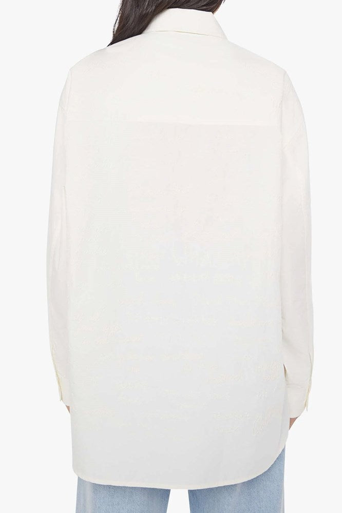 An oversized button-up blouse with drop shoulders and a curved hem. Made from 100% cotton in antique white, the top features chain-stitched and embroidered idioms on the back and MOTHER's name in cursive on the chest.