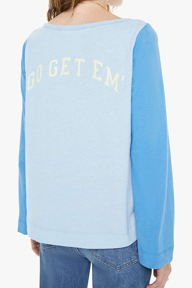 Settle the score. An athletic-inspired long-sleeve crewneck with a loose, comfortable fit. Made from 100% cotton in light blue with dark blue sleeves, the shirt is designed with a red text graphic on the front.