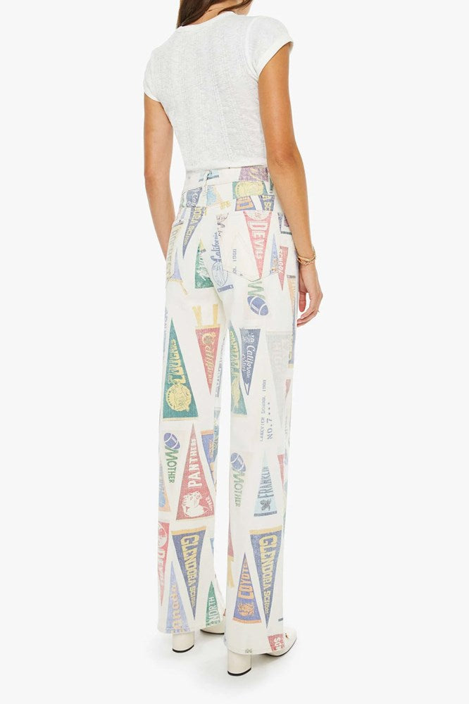 School spirit. Super high-rise pants with a loose fit, wide leg, zip fly and 32-inch inseam with a clean hem. Made from semi-rigid SUPERIOR cotton, Pep Rally is an off-white with a faded pennant print throughout.
