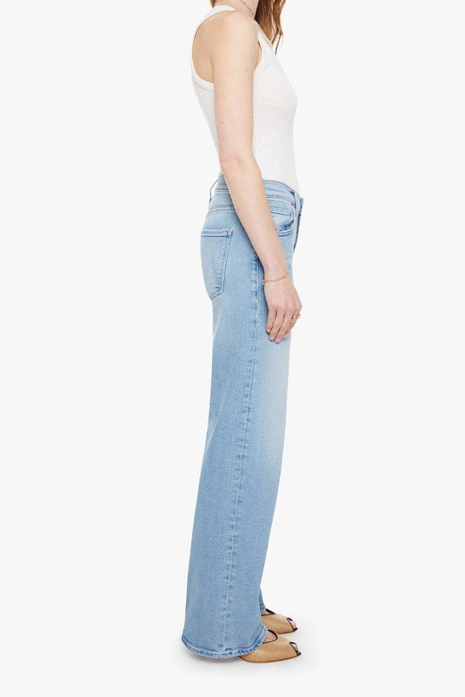 Change is in the air. Mid-rise jeans with a loose fit, zip fly, wide leg and 34-inch inseam with a clean hem. Made from stretch denim, Blowing In The Wind is a light-blue with whiskering and fading at the knees.